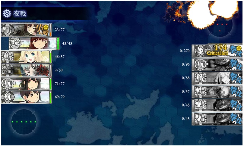 ボスを1発も殴らずに帰ってくる艦隊に泣きそうになりながらやってたE2と違って航空戦に雷撃(開幕、近接)まで使って手数で攻められる通常マップはやっぱりストレスなくていいわ